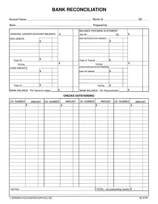 Bank Reconciliation Pad. Size 8 1/2″ x 11″. 50 sheets per pad. Printed on white bond paper.