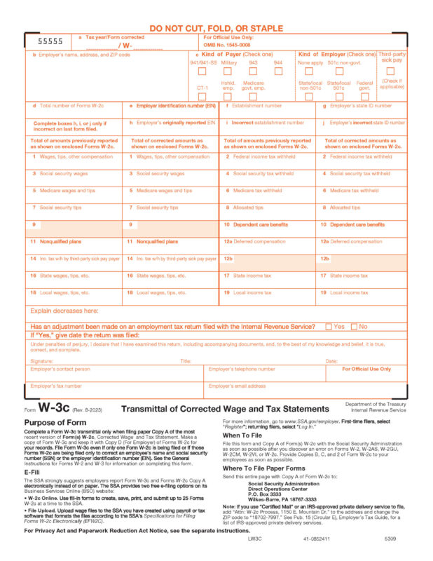 TRANSMITTAL FORM FOR W-2C Corrected Wage and Tax Statement Laser Printer form. Use to correct errors in previously filed W-2 forms. Printed in red and black ink. Each package contains 50 sheets.
