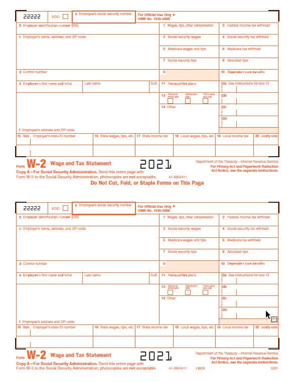 FEDERAL Copy A W2 Laser Printer form. 2-forms-per-sheet format. Printed in red ink. Each package contains 500 sheets. 1,000 employees per 500-sheet package. Use the Double Window DWCL or Single Window SWCL envelopes for these W-2 forms.