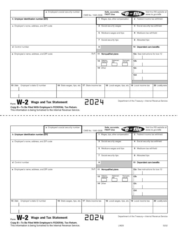 FEDERAL Copy B W2 Laser Printer form. 2-forms per sheet format. Printed in black ink. Each package contains 500 sheets. 1,000 employees per 500-sheet package. Use the Double Window DWCL or Single Window SWCL envelopes for these W-2 forms.